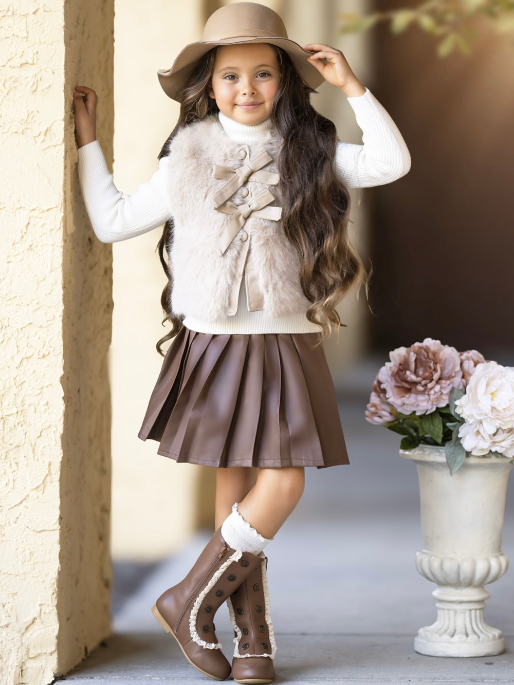 Taupe Faux Fur Bow Vest and Brown Pleated Skirt Set