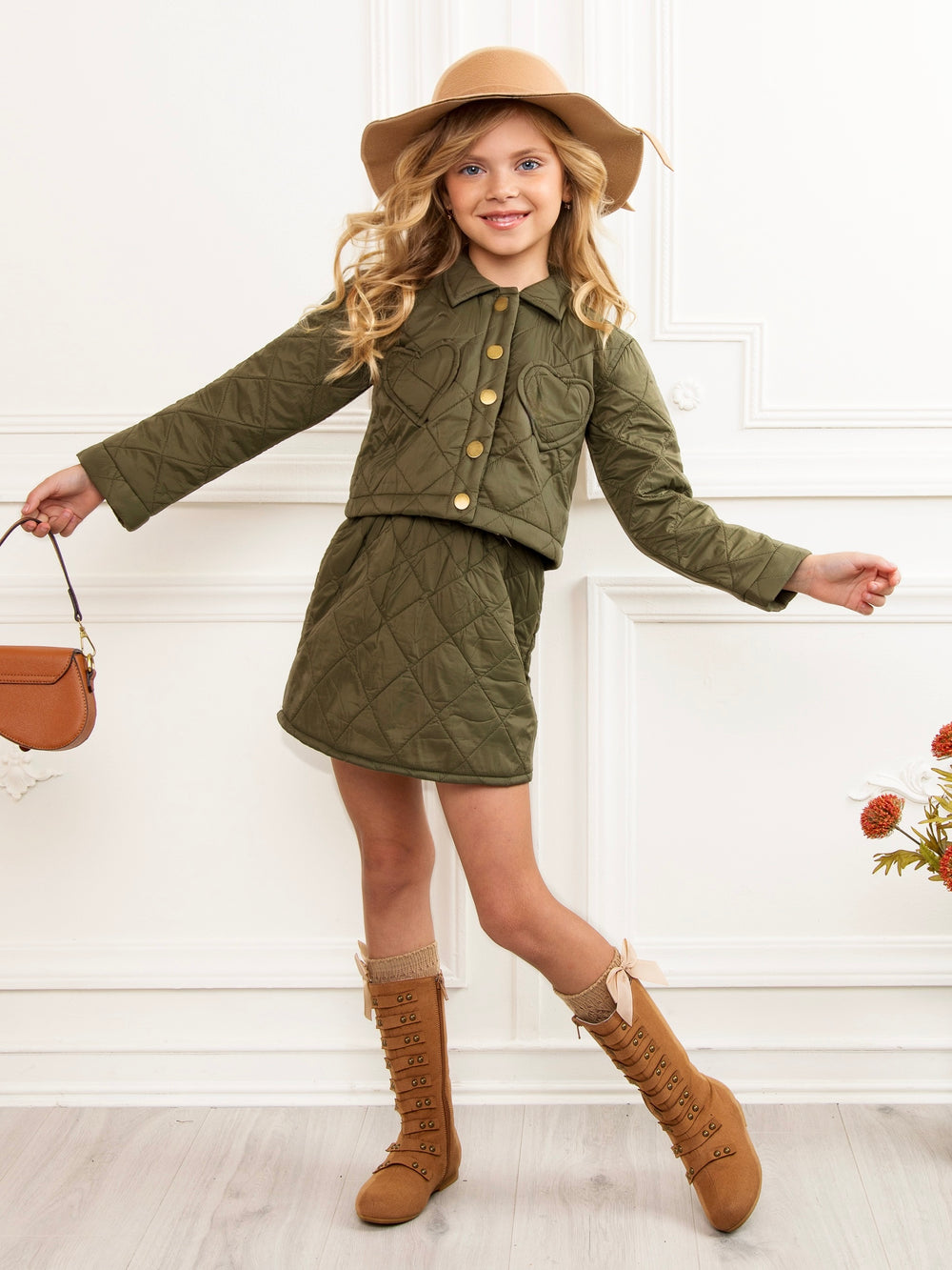 Olive Heart Nylon Quilted Jacket and Matching Skirt Set