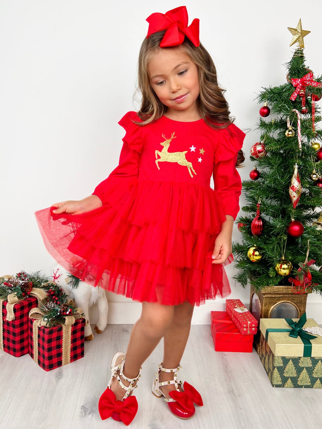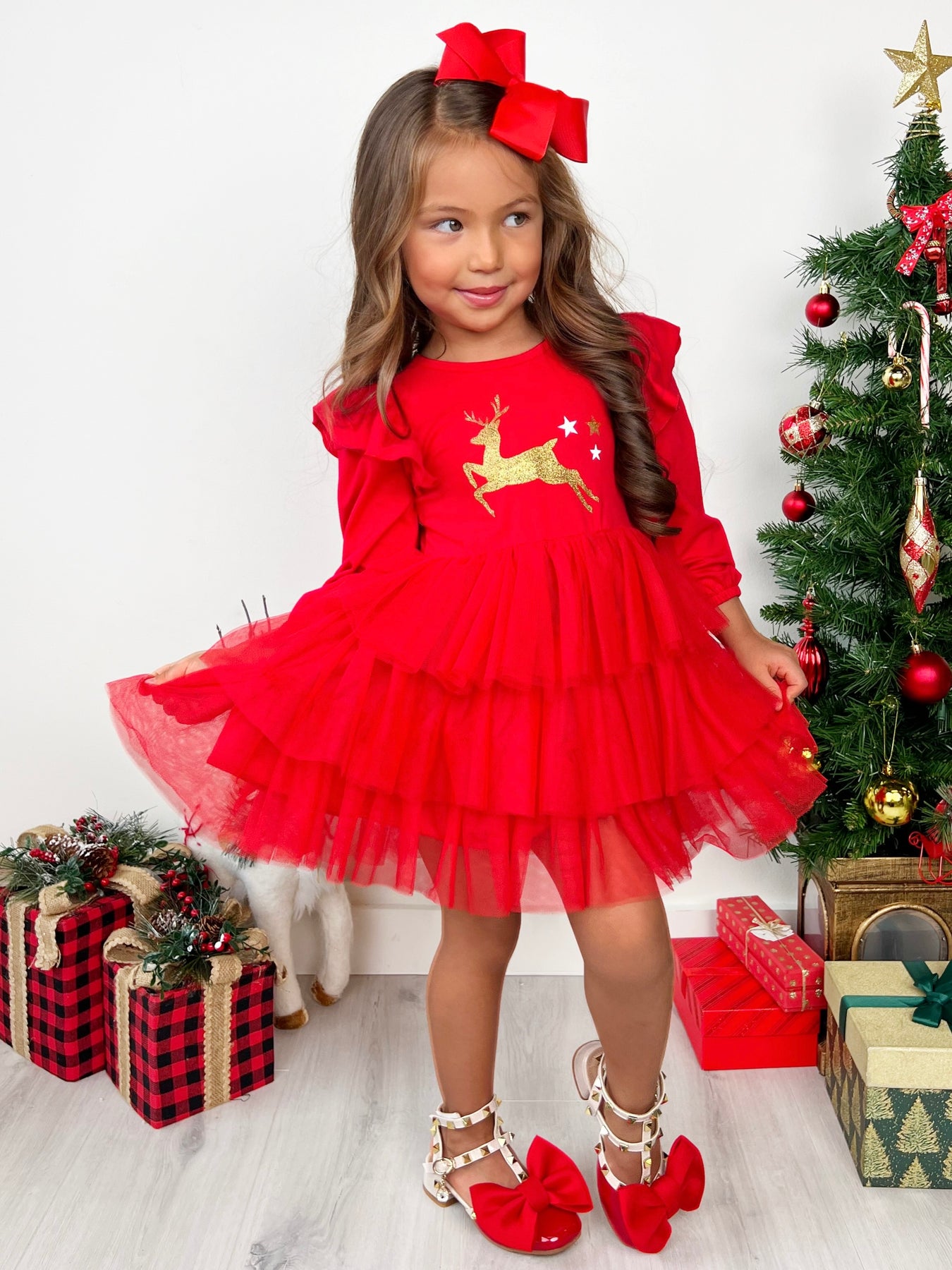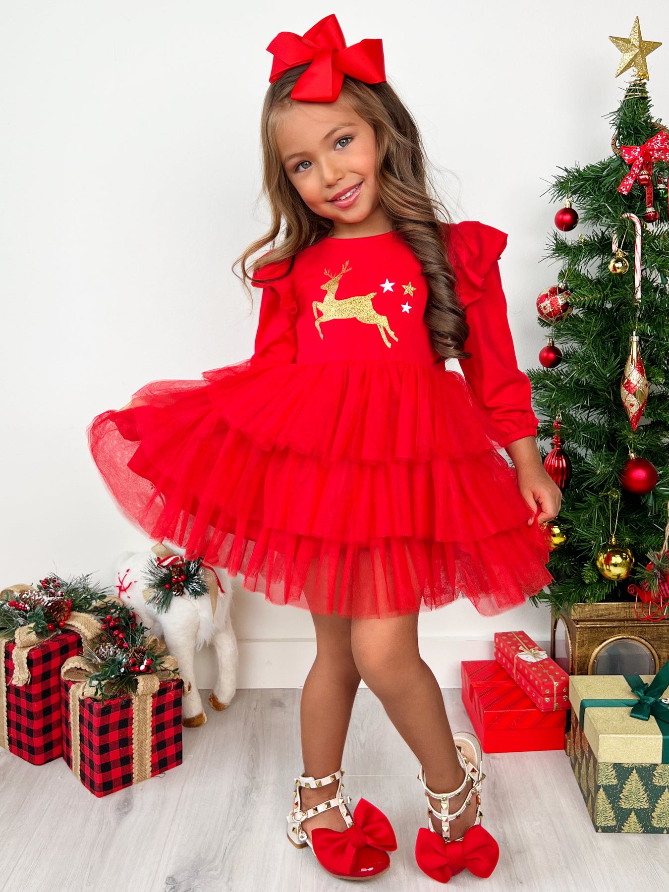 - Celebrate the magic of the holiday season with our Merry Reindeer Ruffle Christmas Dress, perfect for creating unforgettable festive moments with your little one!