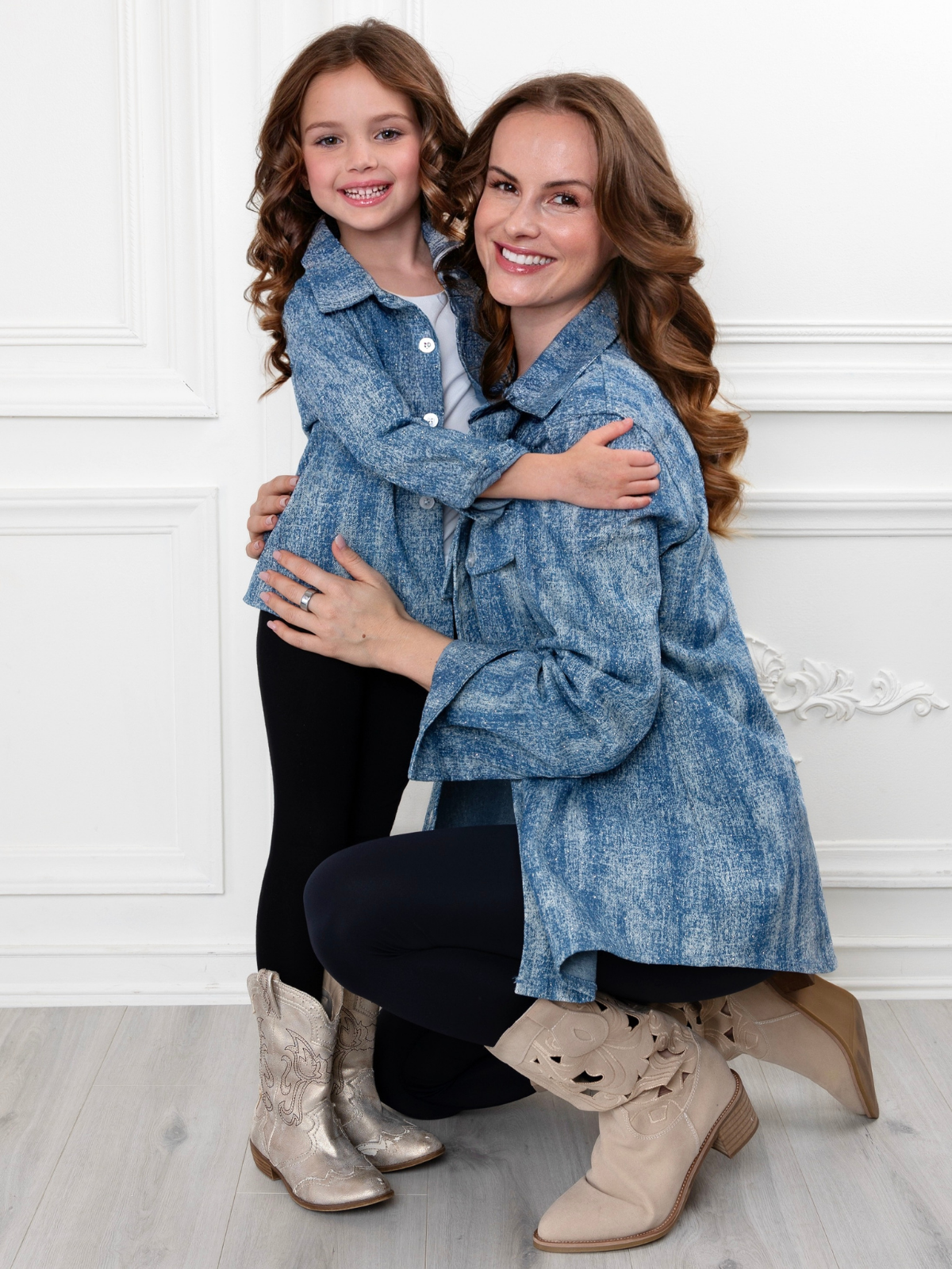 Twinkle together in style with this sparkling Mommy & Me denim shacket — perfect for matching moments with major glam!