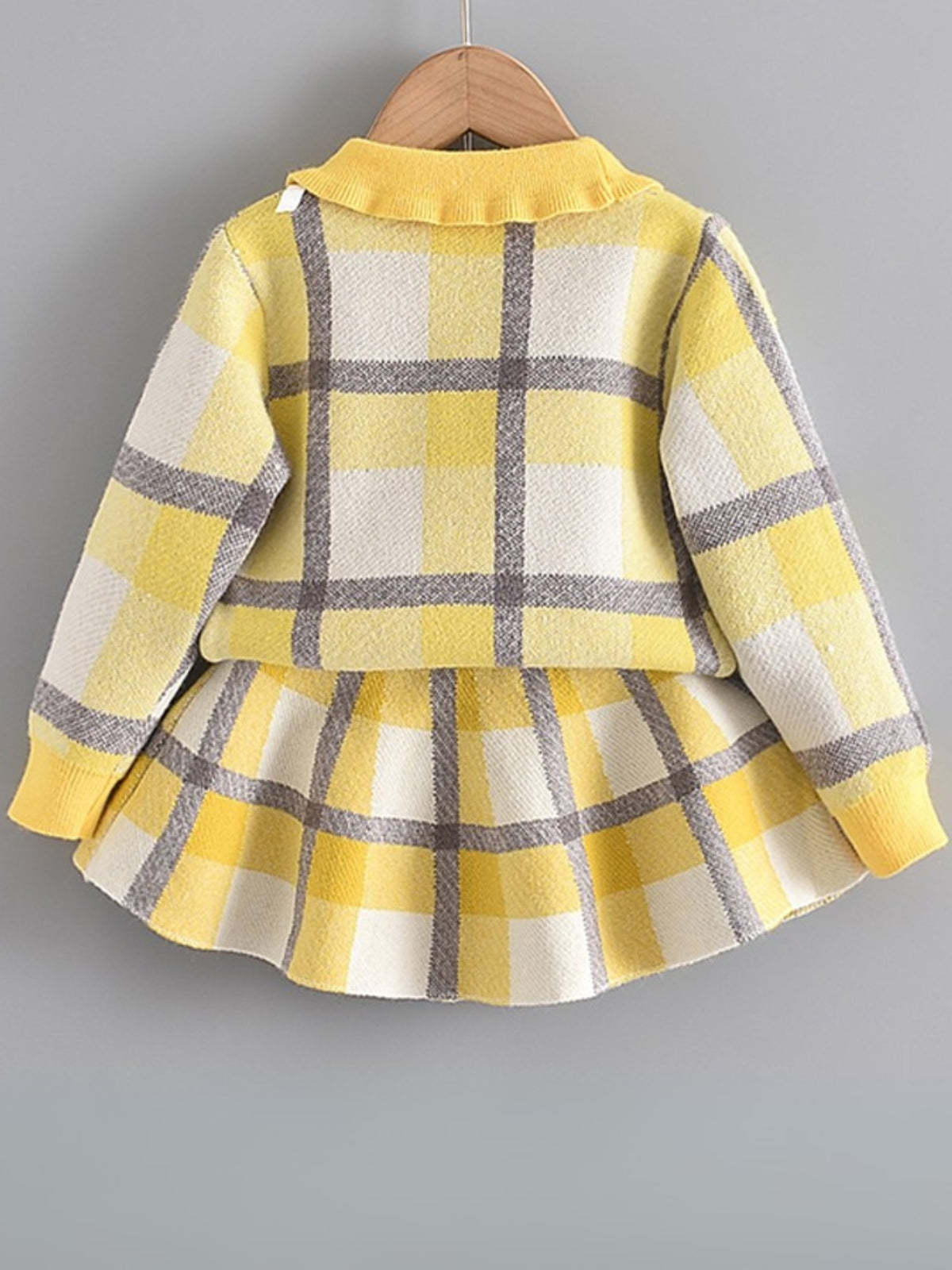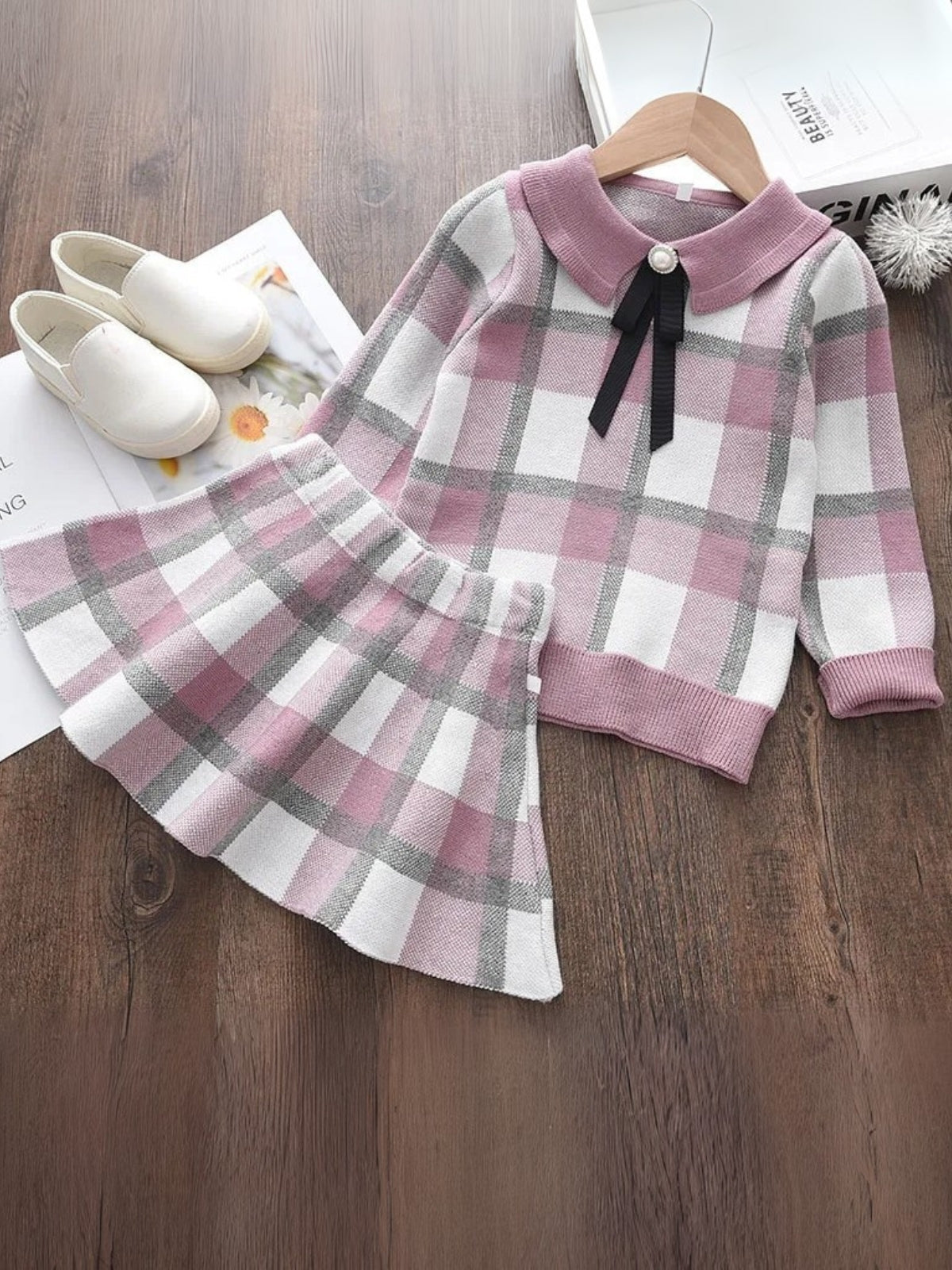 Soft, stylish, and sweet as can be—this plaid knit skirt set is a must-have for the season. Featuring a cozy long-sleeve top with a Peter Pan collar and elegant pearl bow detail, paired with a matching pleated skirt, this outfit brings charm and comfort to cooler weather.