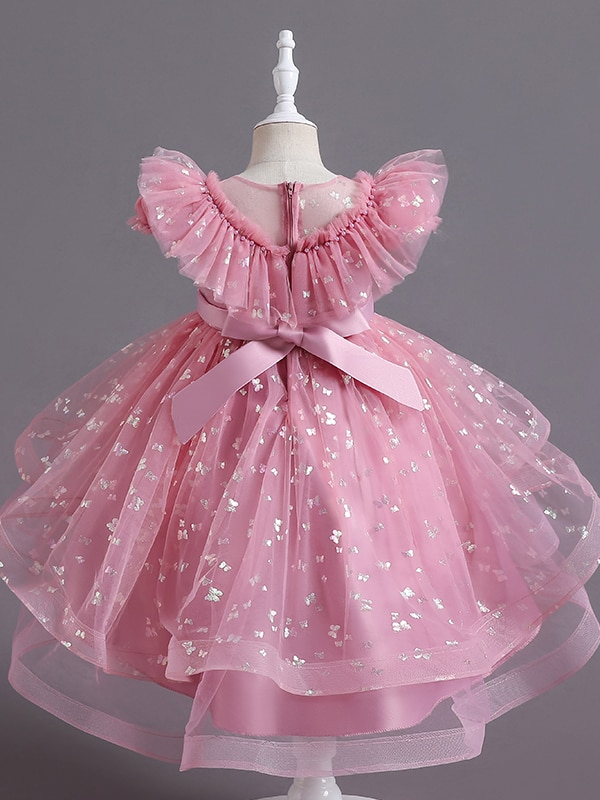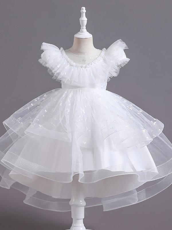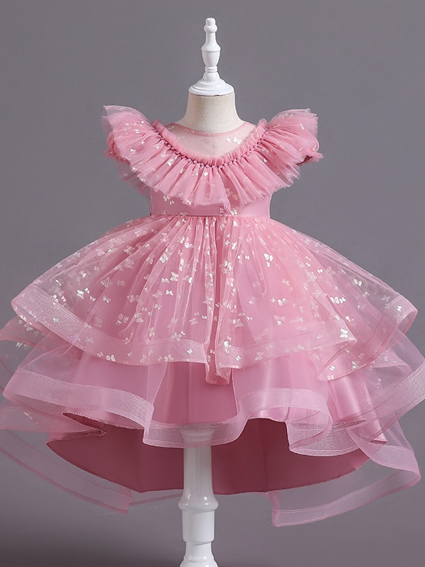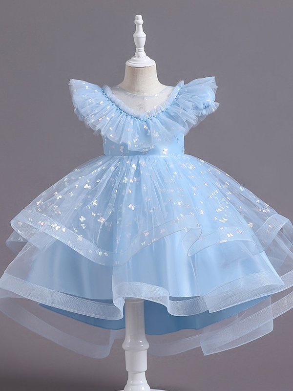 Sleeveless princess dress with sequin butterfly flutter ruffle collar, bodice, and peplum overlay, and tiered hi-lo mesh skirt overlay