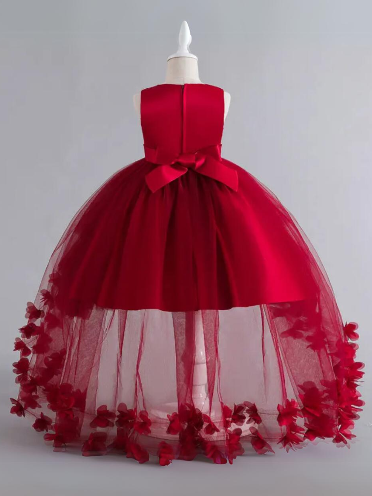 Sleeveless tulle gown with beaded bodice, bow waistband, layered tulle skirt, and skirt overlay with floral appliqués
