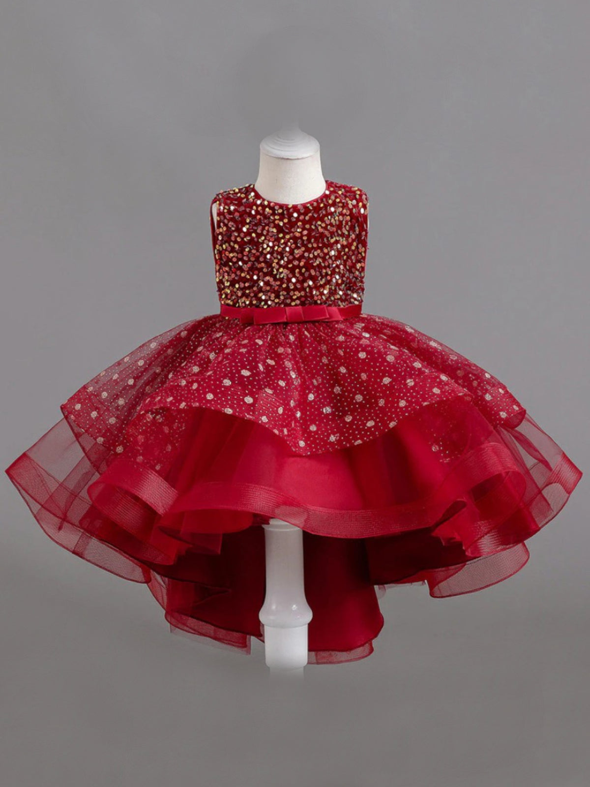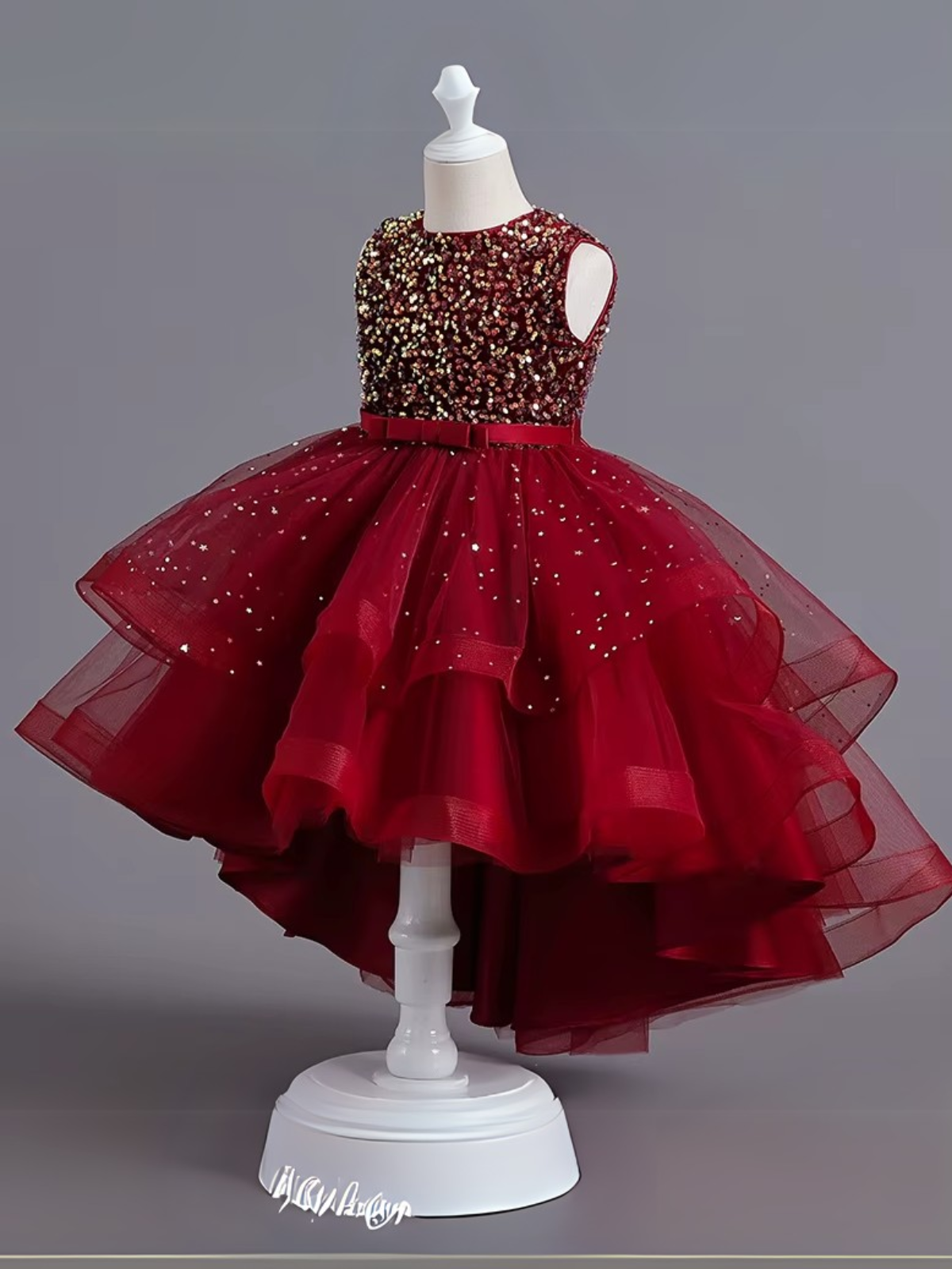- Let her sparkle! Our sequin belted dress guarantees that your little girl will look her best at her most special events. Adorned with glittering details and finished with a layered tulle skirt and statement silk bow for a dramatic finish. Because every princess deserves a look-at-me moment!