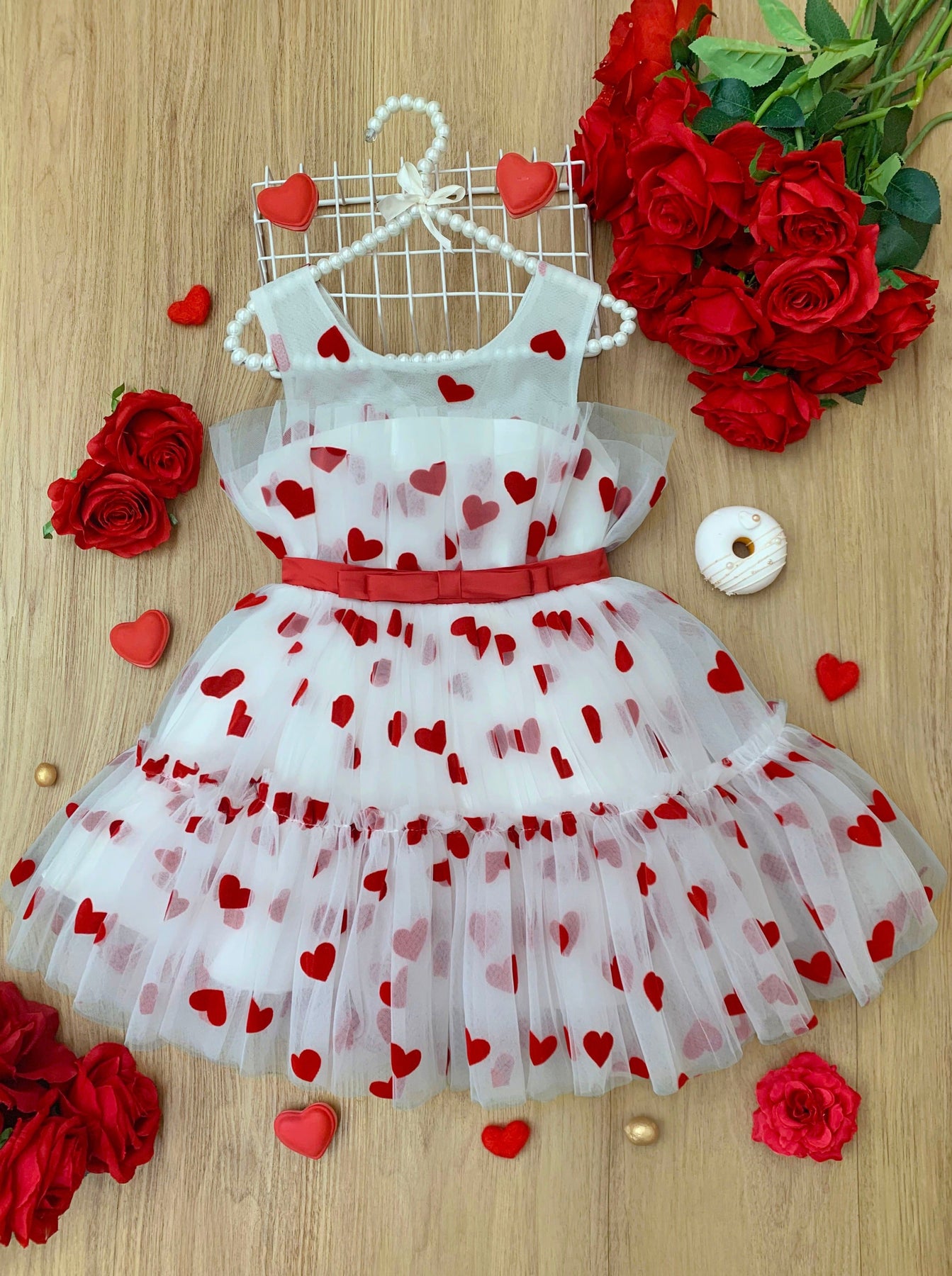 Sleeveless tulle dress with sheer shoulders, gathered tulle bodice, all-over felt heart pattern, and red satin belted waist; zip in the back