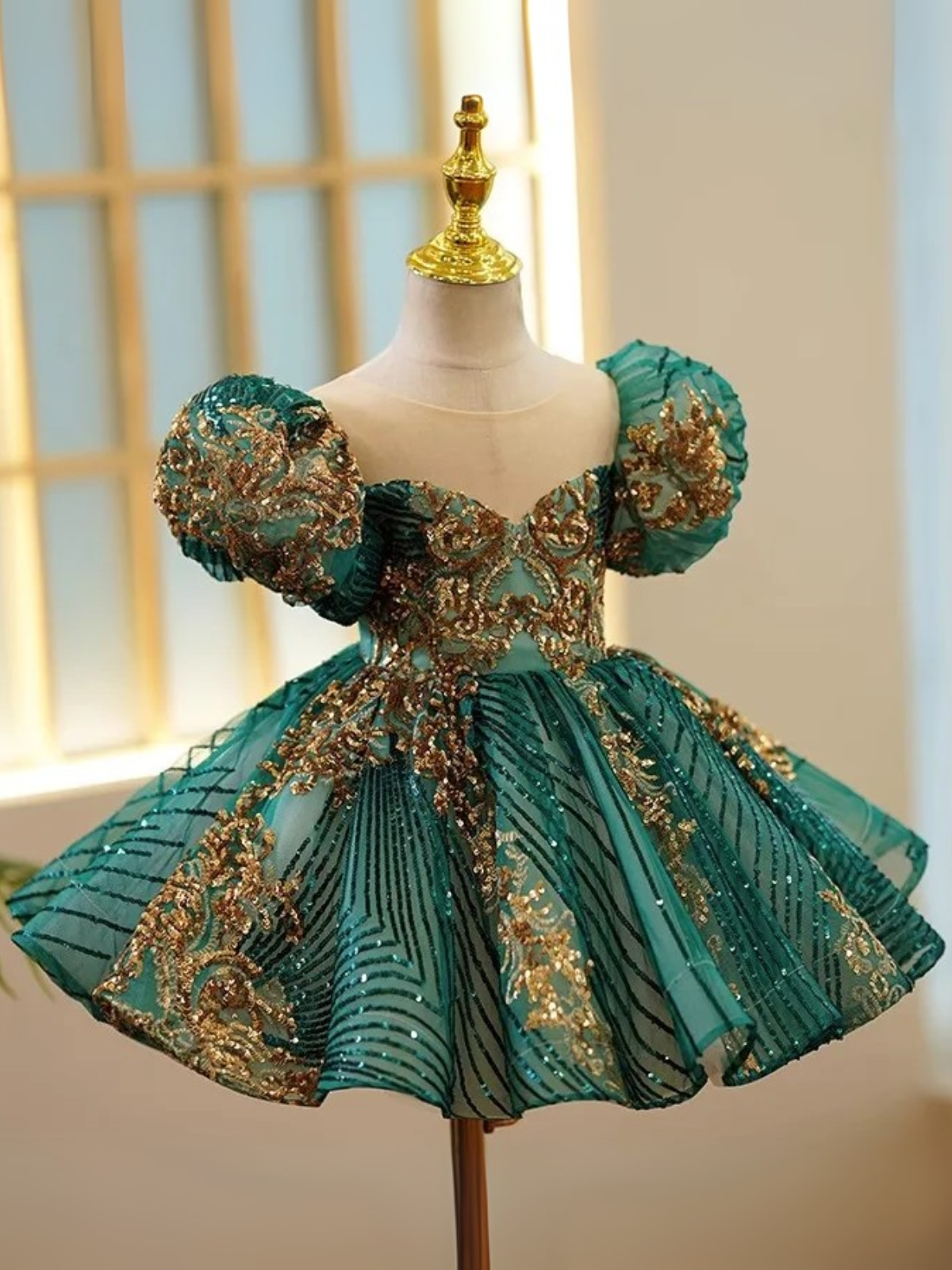 - This enchanting puff sleeve mini dress comes straight out of your little girl's fashion dreams! She'll love being the center of attention with its golden and green sequin detailing!