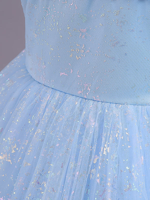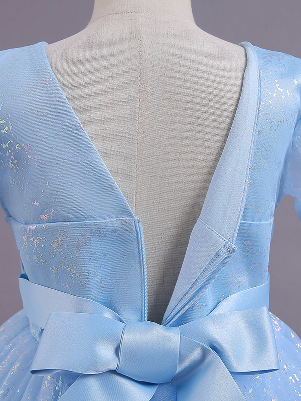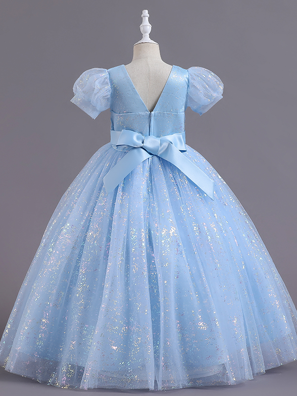 • This enchanting puff sleeve glitter ball gown comes straight out of your little girl's fashion dreams! She'll love being the center of attention with its sparkling full-length skirt and pearl accents