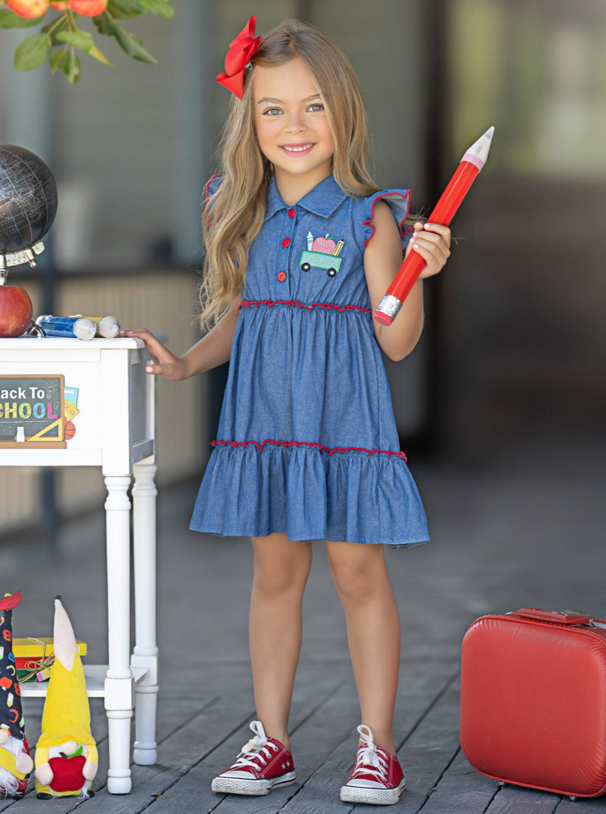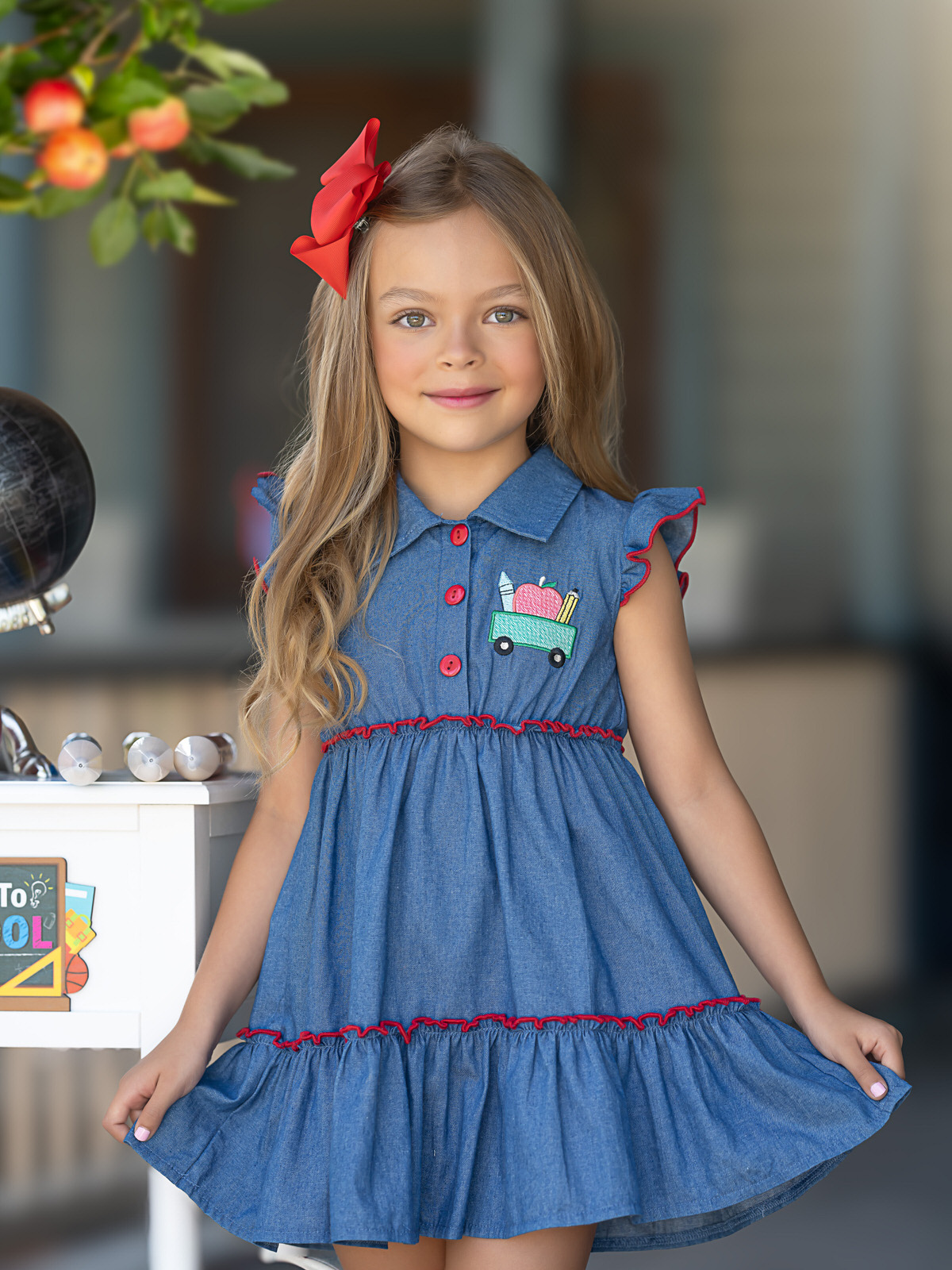 - Chambray denim tiered dress with flutter sleeves, buttoned bodice, red ruffle trim, and back-to-school truck embroidered chest patch