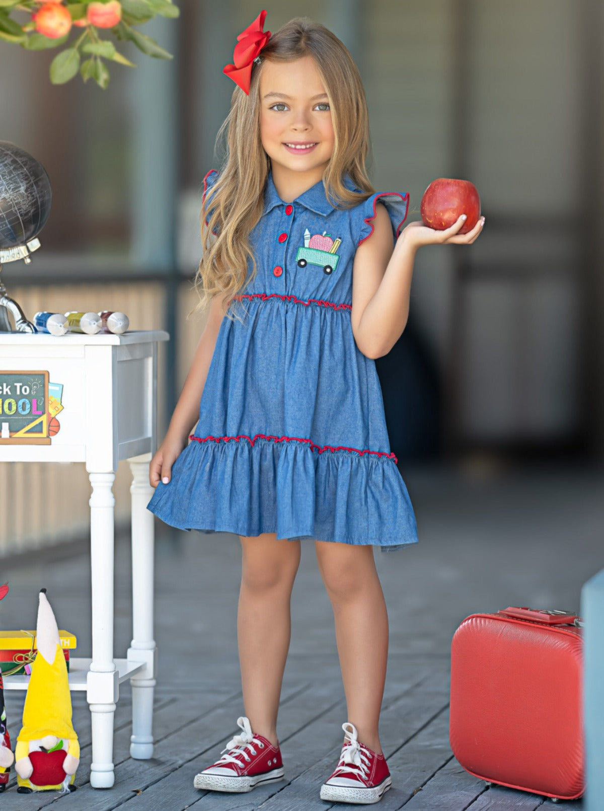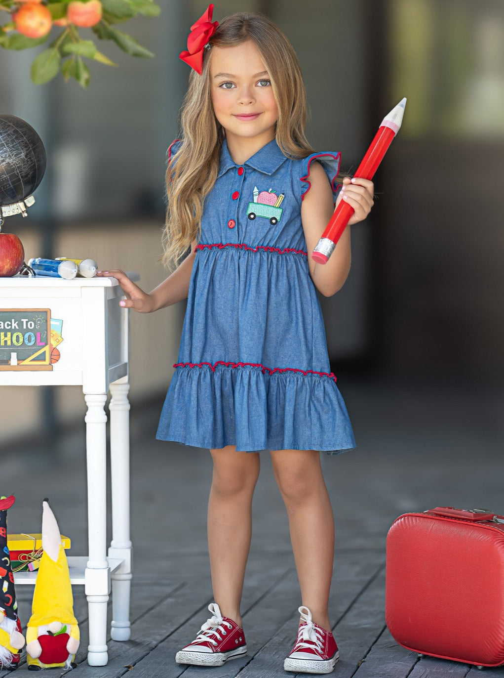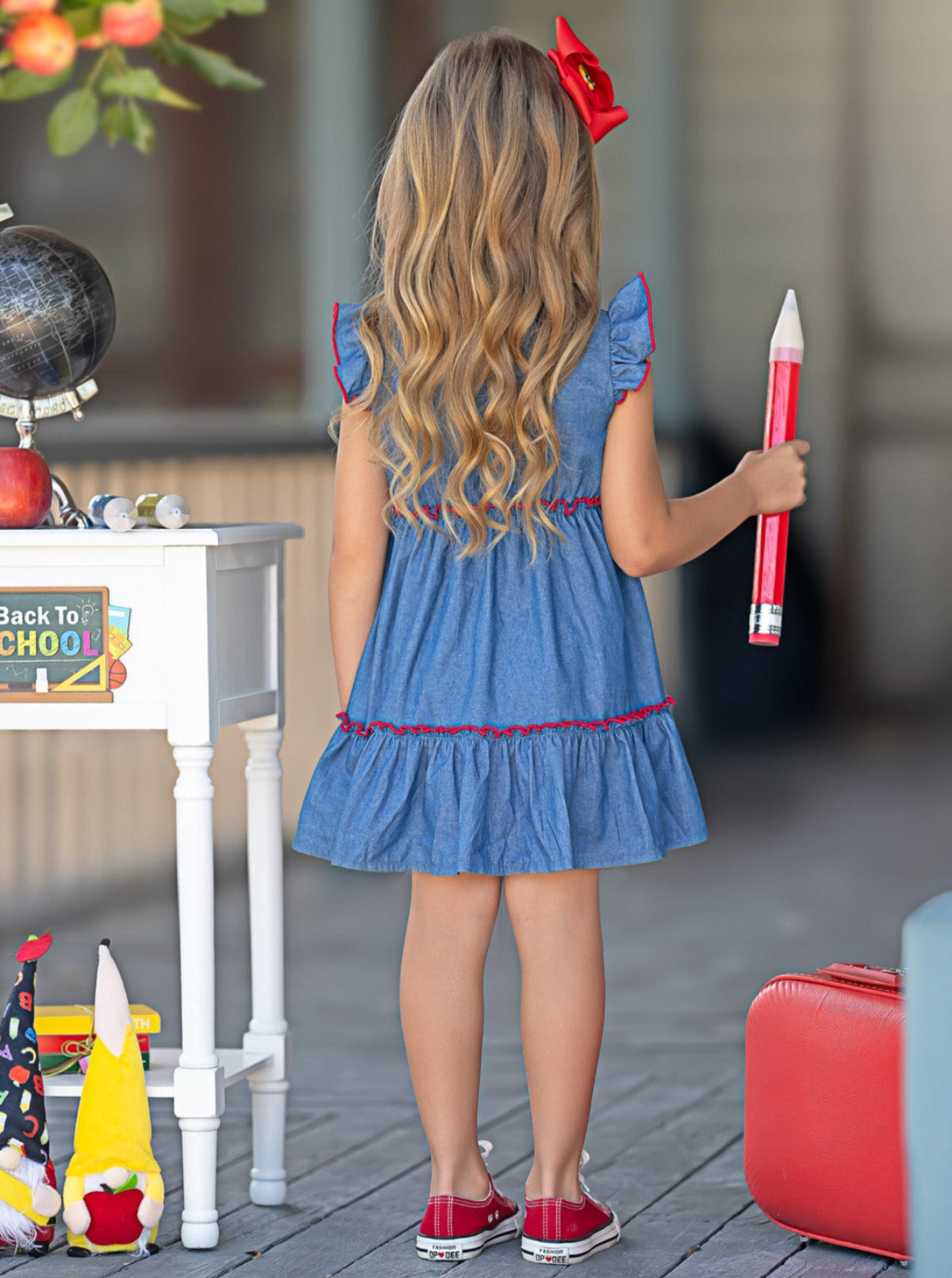 - She's sure to get an A+ in style when she dresses up in our ruffle trim denim dress. Flutter sleeves, a-line silhouette, and red trim for a look that will instantly make her a classroom cutie!