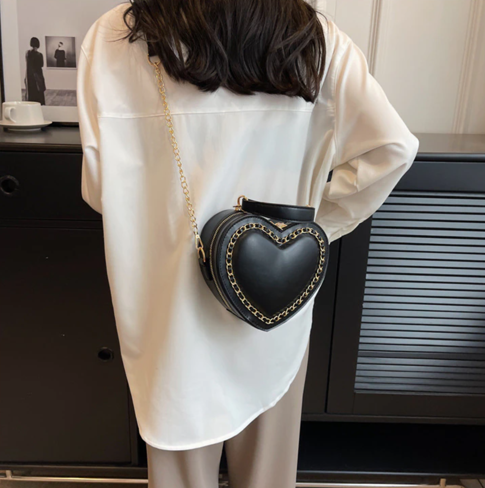 Heart-shaped handbag with crossbody chain strap and tote handle